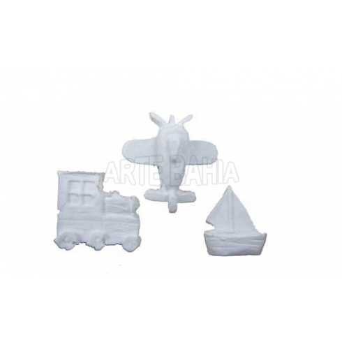Trem: 1,8x1,8cm / Avião: 2,5x2cm / Barco: 1,5x1,5cm.
