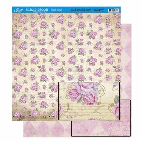 Folha para Scrapbook Dupla Face - SD0479 - Buque de Rosas Fundo Bege com Escritas