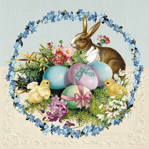 Guardanapo Páscoa - Coelho, Pintinho e Ovos (351)Fundo azul e creme Arco de Flores