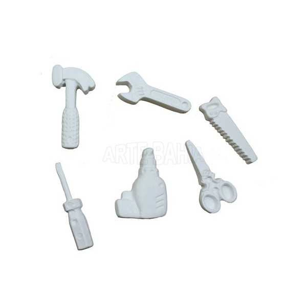 Medidas: Serrote 0,8x3m - Chave de Boca 3,5x1,5cm - Chave de Fendas 3,5x0,5cm - Martelo 3,5x2cm